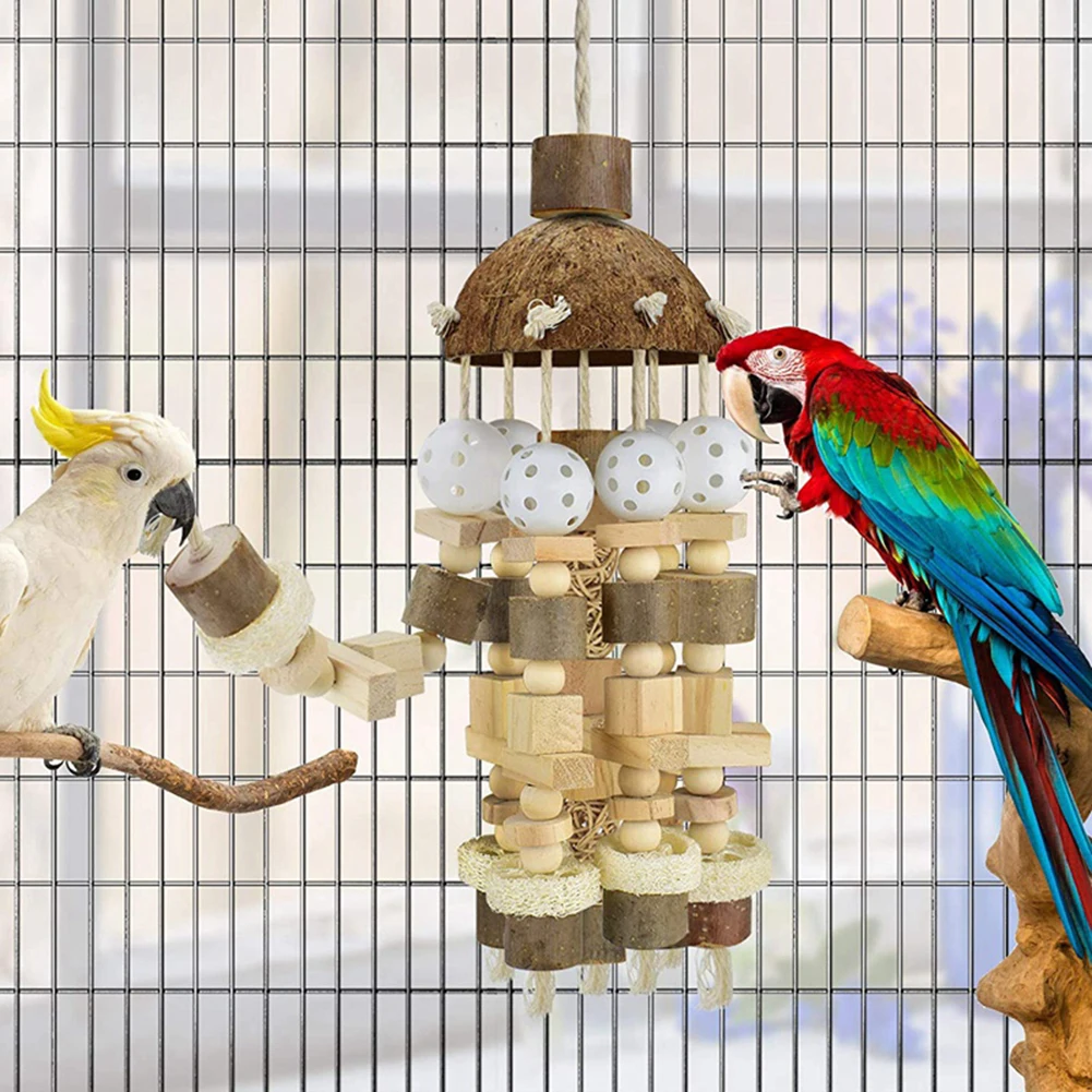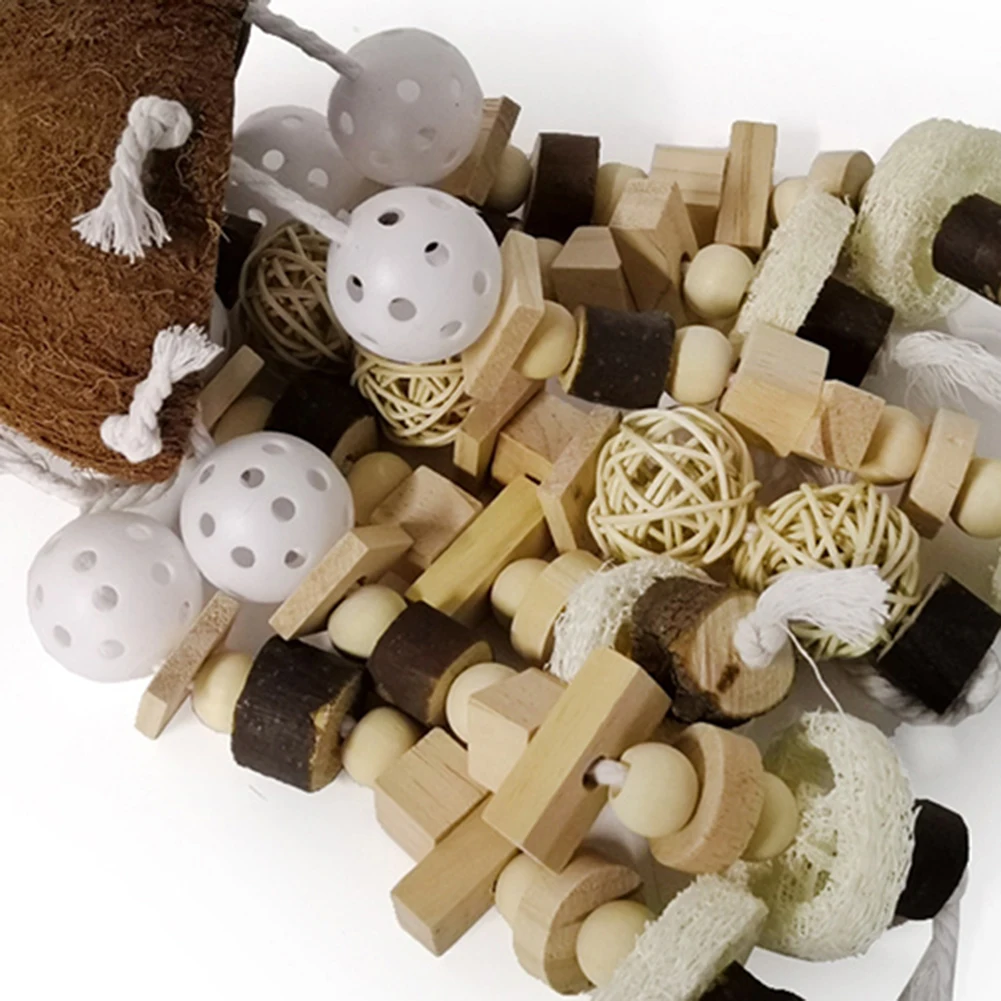 Parrot Cage Chewing Toy Health Pet Bird Macaws Cockatoos Bite Coconut Shell Hanging Wooden Blocks String Tearing Accessories