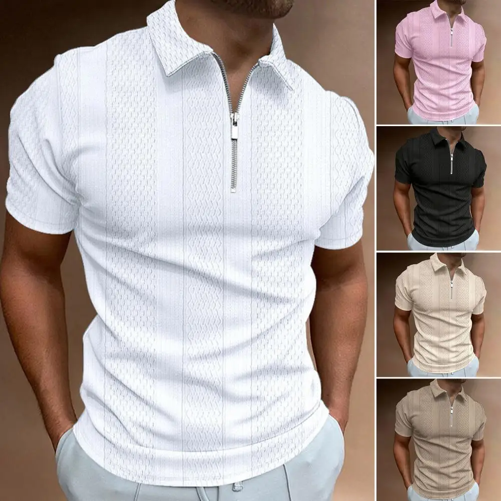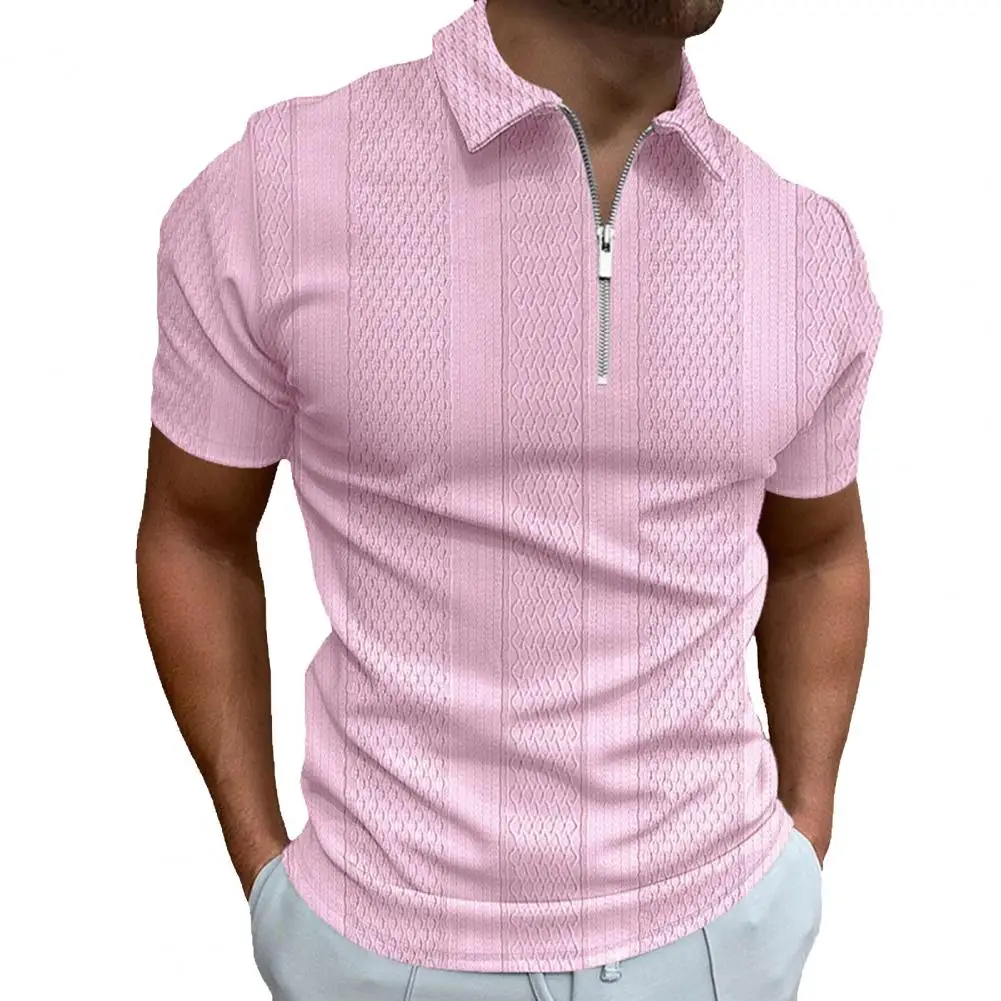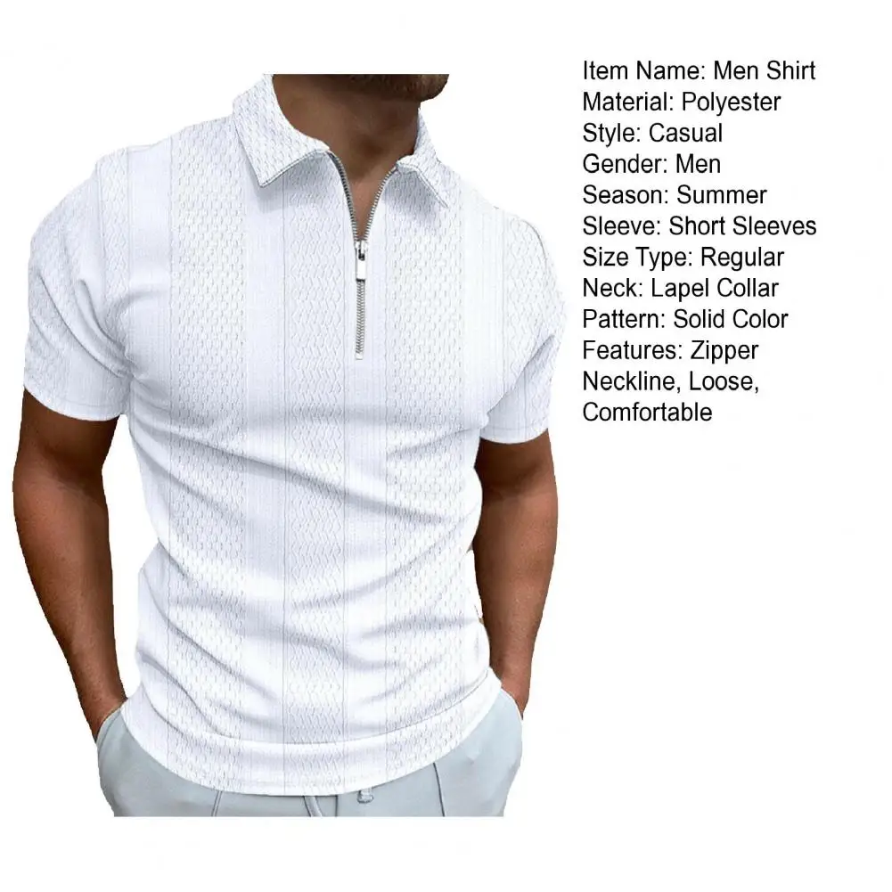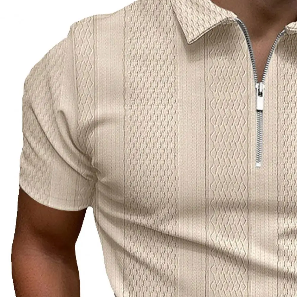 Men Shirt Turn-down Collar Zip Neckline Solid Color Short Sleeves Pullover Casual Wear Vertical Stripes Male Tops Summer Fashion T-shirt Commuter Wear