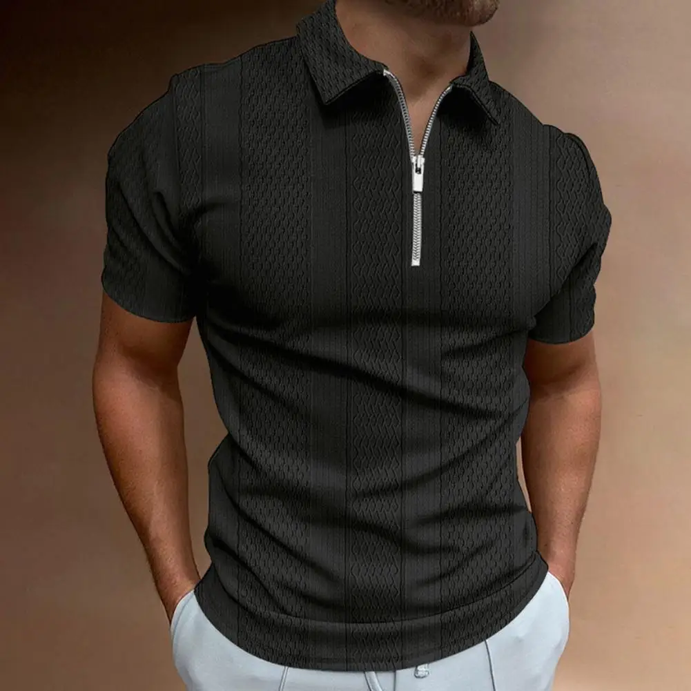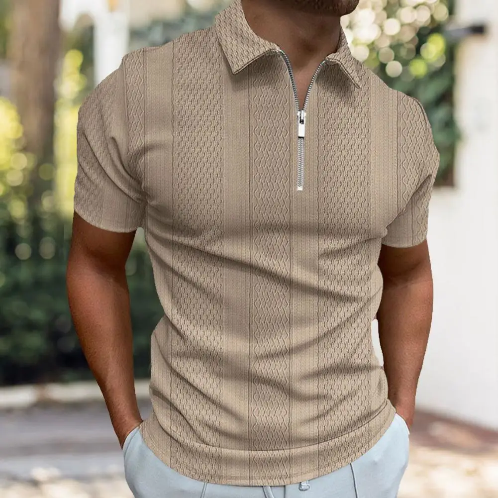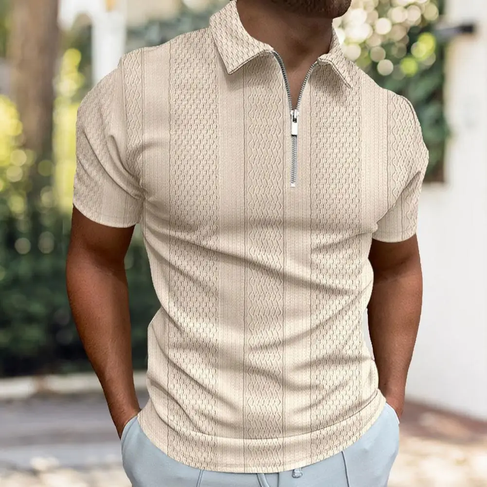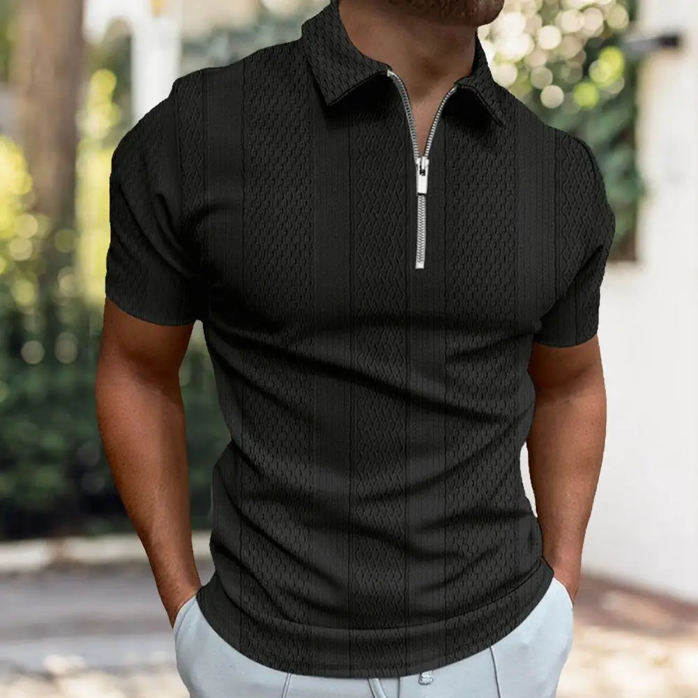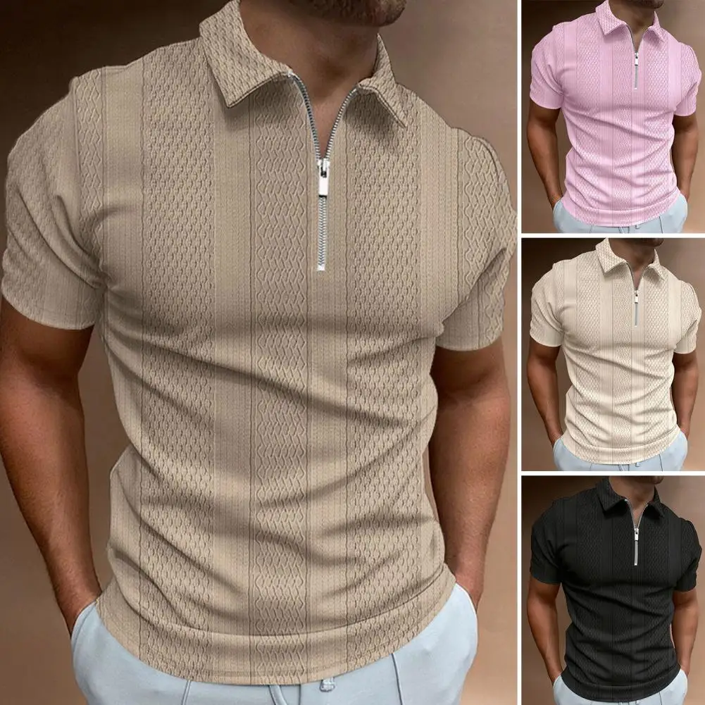 Men Shirt Turn-down Collar Zip Neckline Solid Color Short Sleeves Pullover Casual Wear Vertical Stripes Male Tops Summer Fashion T-shirt Commuter Wear