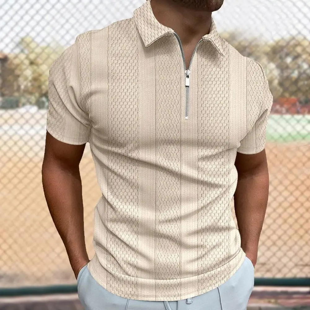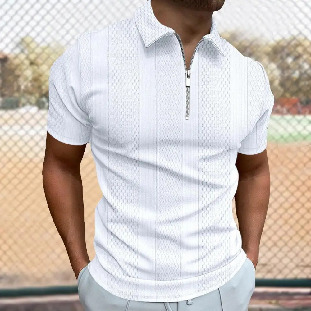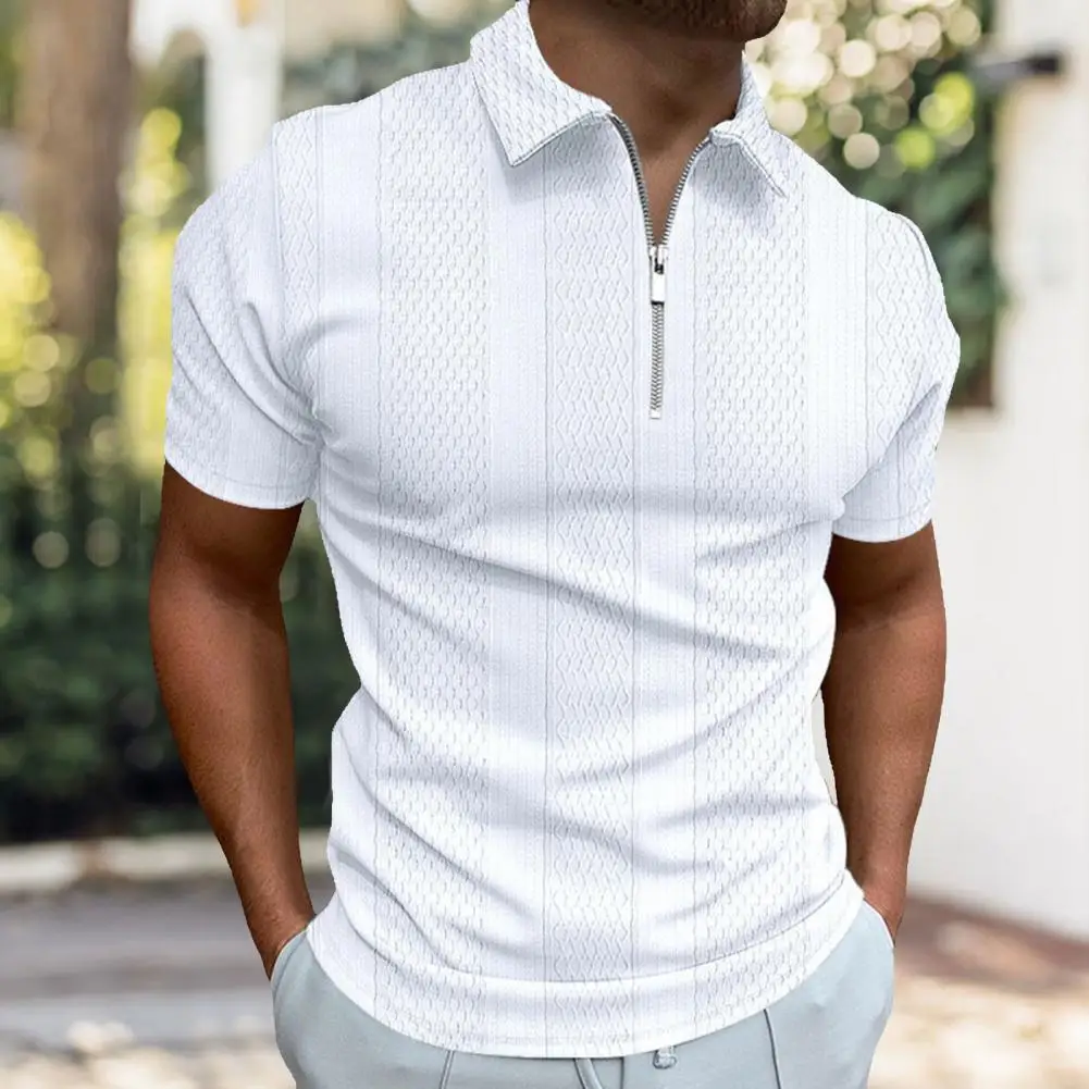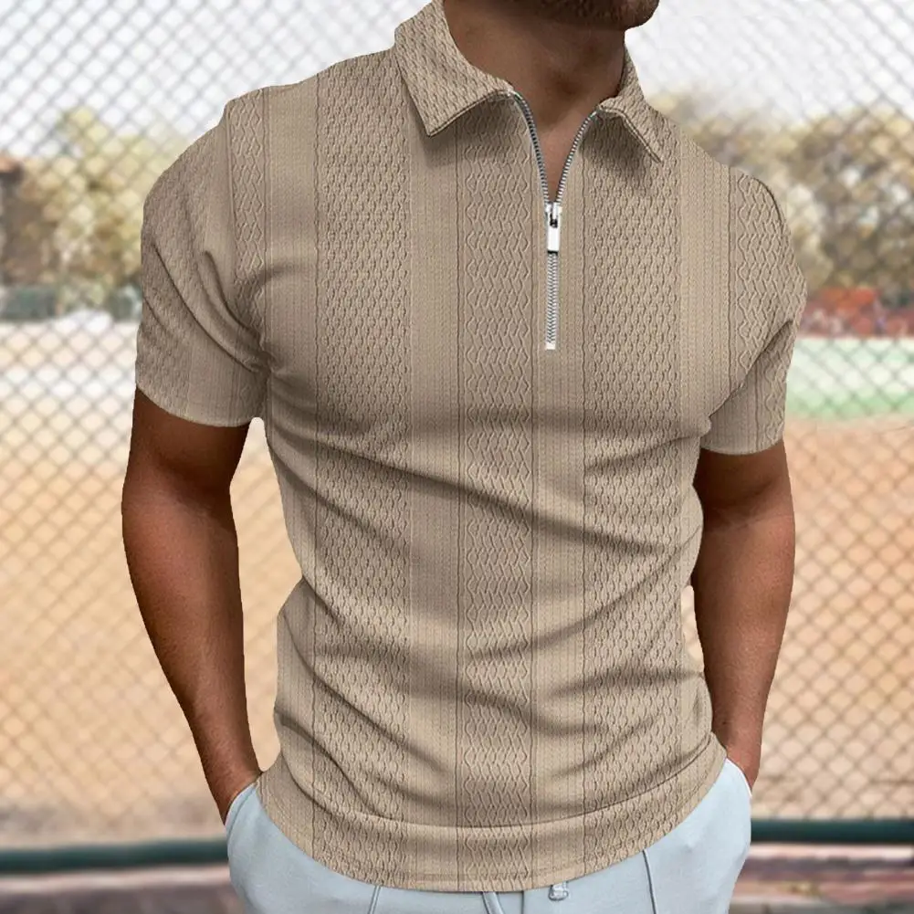 Men Shirt Turn-down Collar Zip Neckline Solid Color Short Sleeves Pullover Casual Wear Vertical Stripes Male Tops Summer Fashion T-shirt Commuter Wear