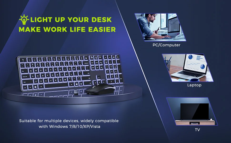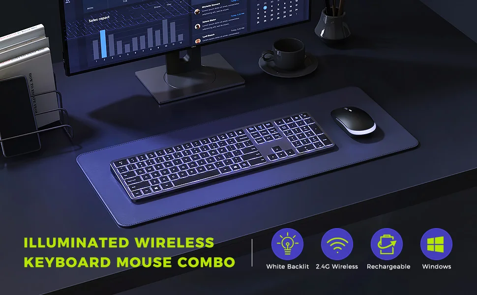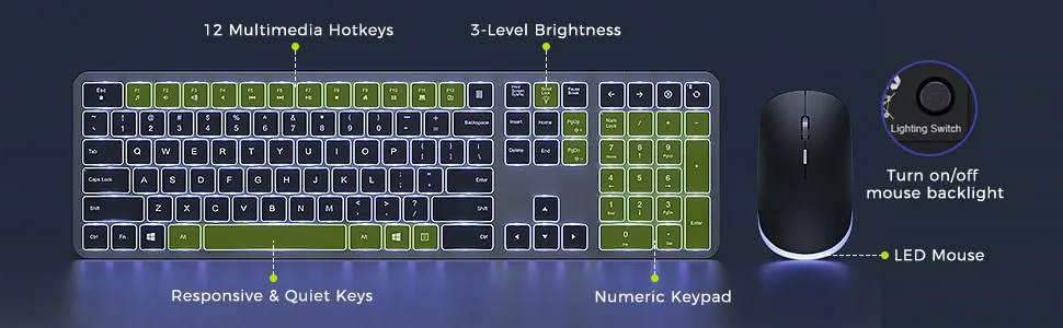 White Backlit Keyboard and Mouse, Light Up Your Desk — Both Keyboard and mouse are designed with white LED backlight that makes them easy and comfortable to use in darkness. The keyboard has 3 adjustable brightness levels: low-mid-high-off, and the mouse can also turn on/off the backlight freely, providing different visual enjoyments.