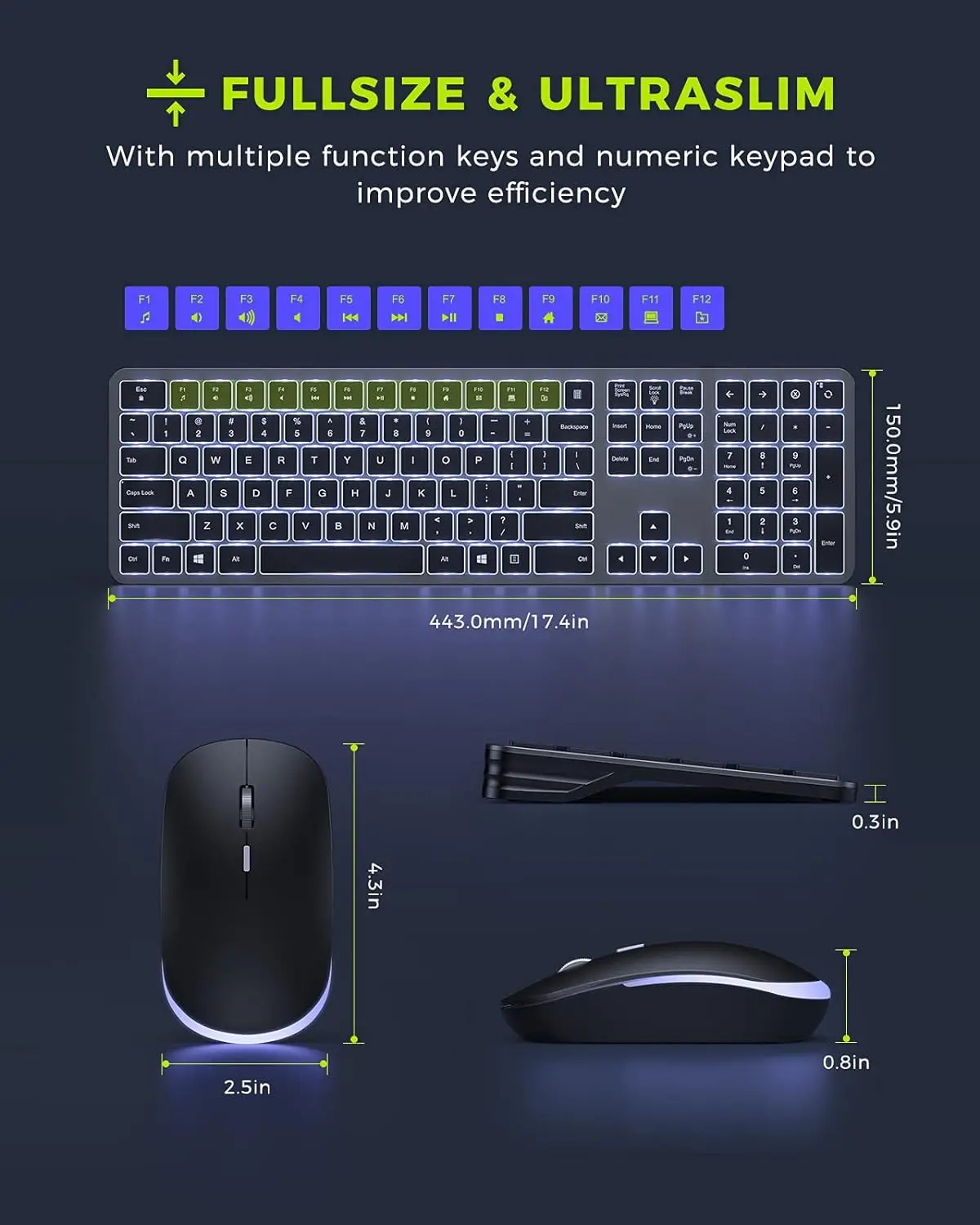 Full Size Ultra Slim Keyboard & Mouse, Work Efficient — Ultra-thin design with only 0.3inch for keyboard and 0.8inch for mouse that makes it easy to carry. Full size keyboard comes with a numeric keypad and multi-function keys, improving your work efficiency. An Fn lock key will also help you switch multimedia/shortcut functions quickly.