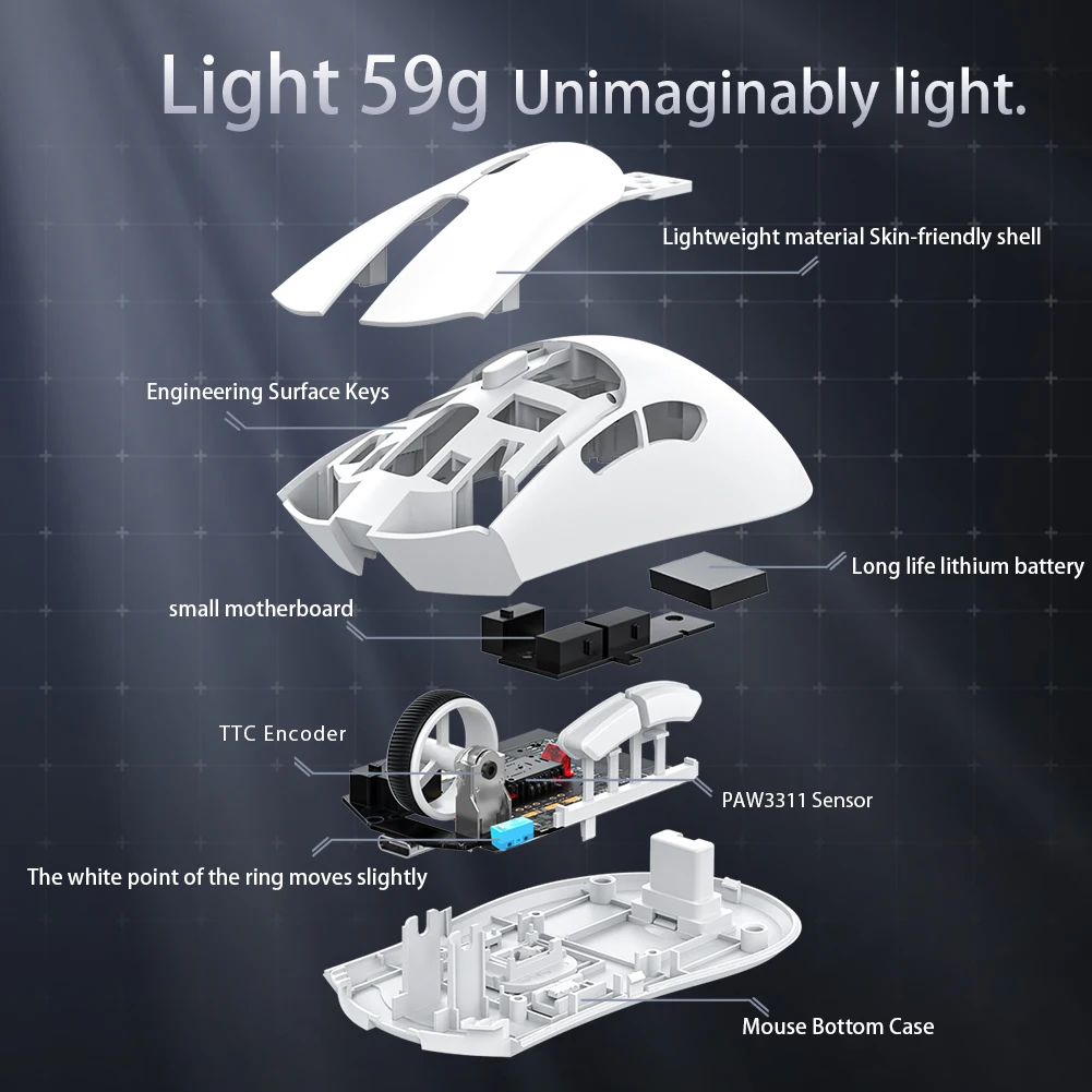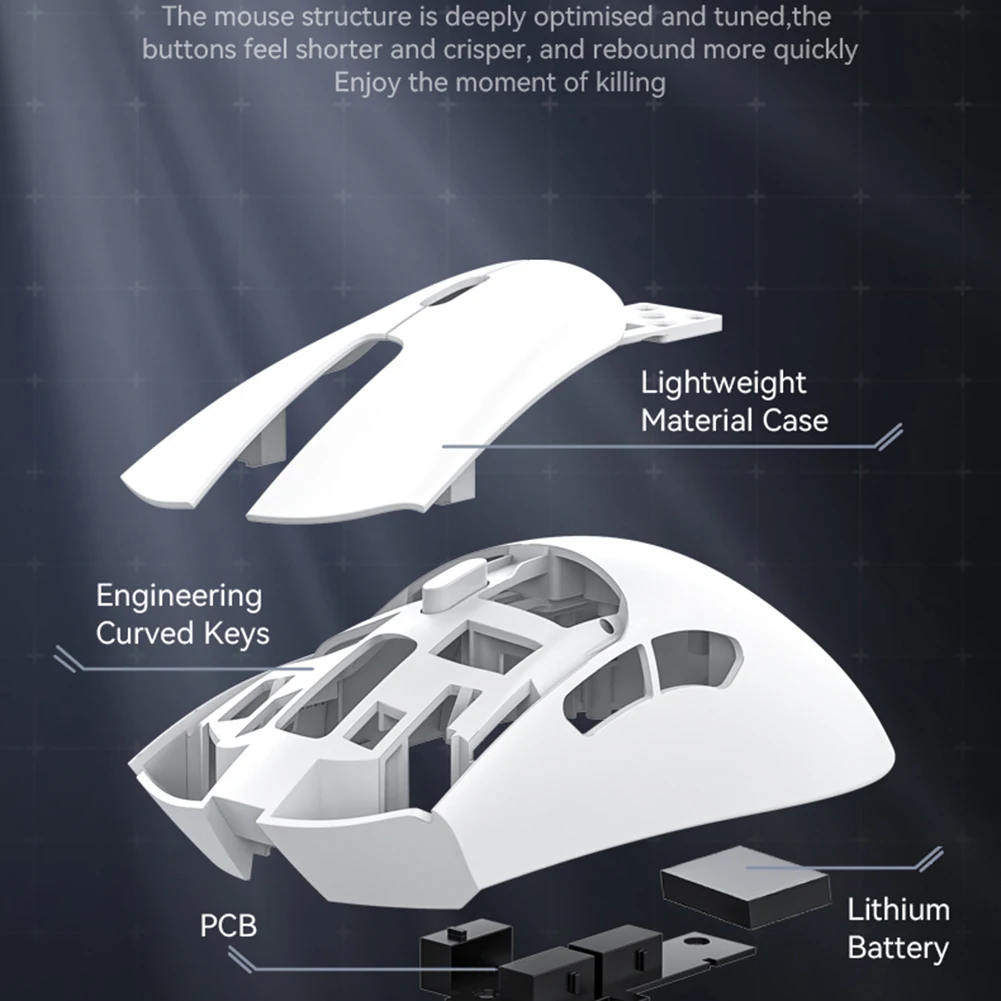 1. Lightweight Design: The wireless gaming mouse features a lightweight design for enhanced maneuverability and user experience. Made with lightweight materials, it reduces the overall weight of the mouse, allowing users to move the mouse quickly and accurately, thus gaining a competitive advantage in esports gaming.